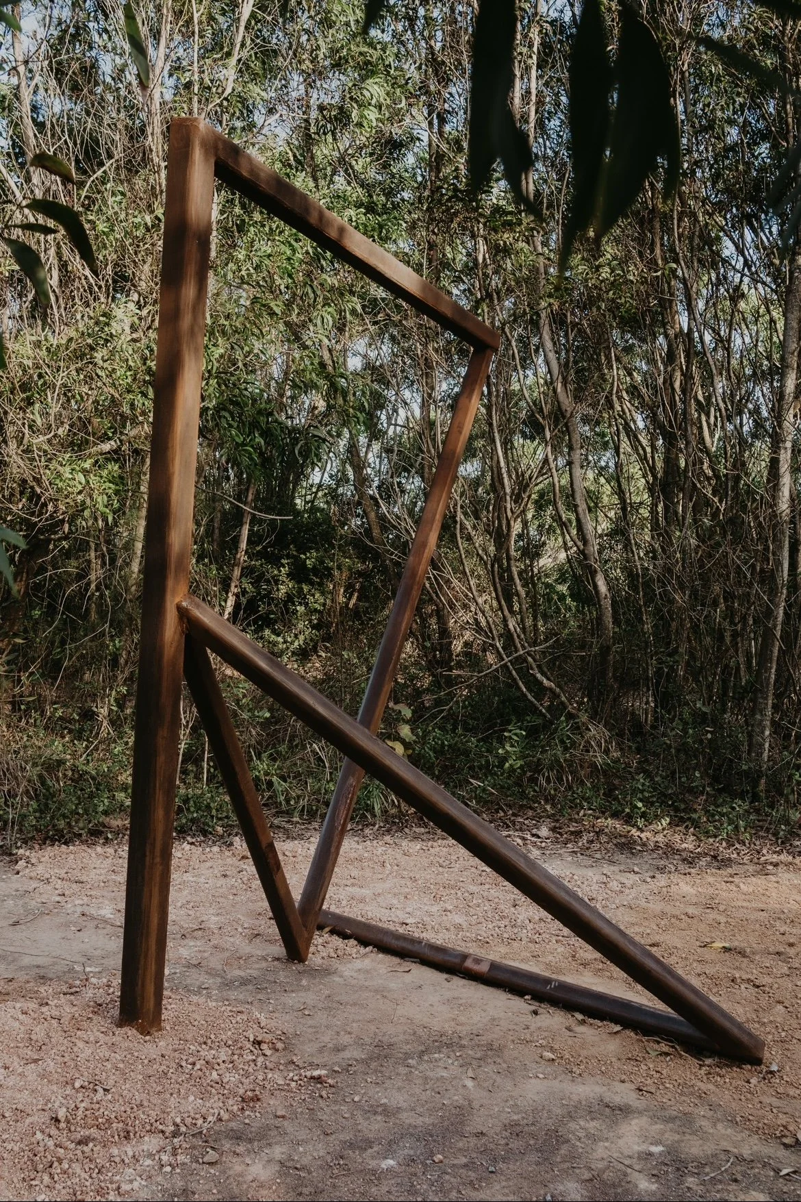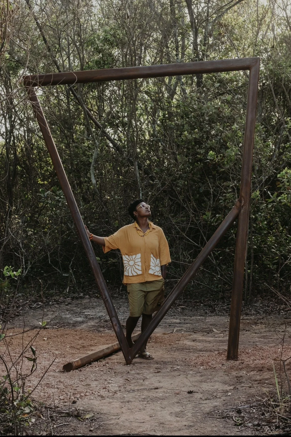 Trazendo seu título em língua Iorubá, OJIJI traduz-se como “sombra”. A sombra busca articular a vitalidade que mora nas dimensões do espaço e do tempo, revelando entre opacidade e descaminhos, sua essência única e vital daquilo de mais importante para celebração dos ancestrais. Considerando a memória como uma tecnologia que fundamenta o senso histórico e a ideia de pertencimento, a escultura versa sobre uma ancestralidade que advém das margens, onde coloca em relação signos do passado, como as rotas transatlânticas, em embate com a paisagem natural.